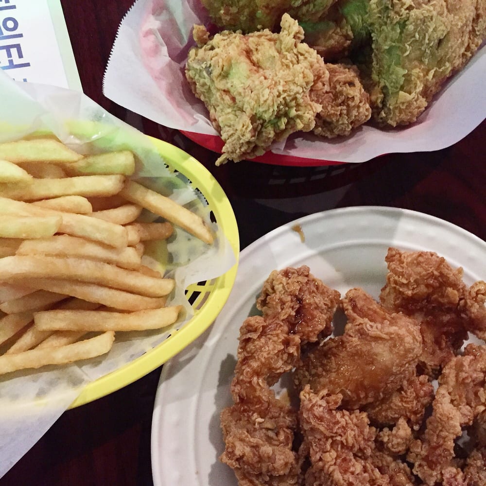 There is a lot of parking and they are opened until 2 AM. They have the best fried chicken out of the dozen places I have tried. They cut their whole chicken into smaller pieces making the breast absorb the marinade better. All of their pieces are very crispy and the chicken is not frozen. The corn cheese is overpriced. They are also very busy even at 10 pm. The only negative about this place is the owners don't hire enough staff. My sister and I went for lunch at 1. They had one young waitress manning the entire restaurant. She had to do everything: seat customers, drinks, orders, set tables, clear tables, bring out food, and phone orders. There was an older man and woman who I think are the owners. They didn't know how to do anything to help her. They kept pacing back and forth knowing she was behind because she had to do everything. There was also a younger lady who might be the owner's daughter or niece. She didn't bother helping also. She only adding receipts. They need more wait staff to improve their service. The kitchen also batched orders... They waited for multiple orders to fry all the chicken at once making the wait much longer. Some waited 15 minutes to be seated and another 35 to 40 for food.